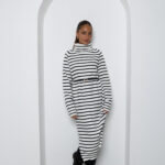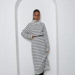 שמלת גולף צנועה, בד סריג, אורך מקסי, מגיעה עם חגורת דמוי עור למותן.