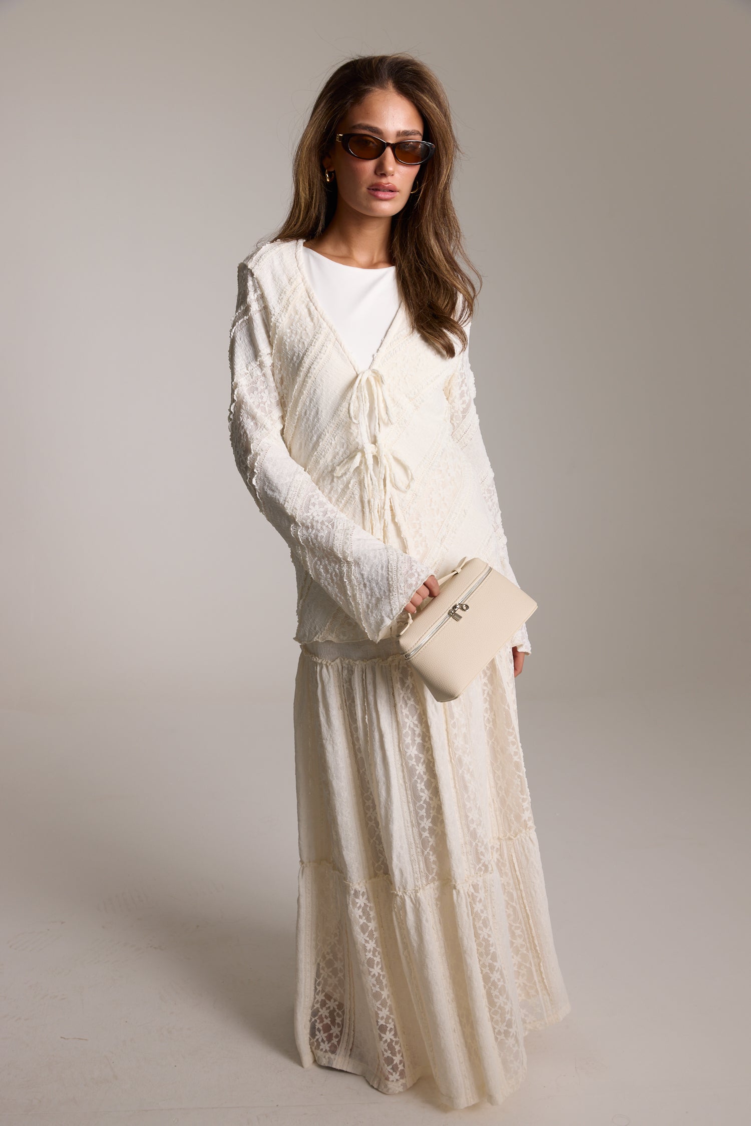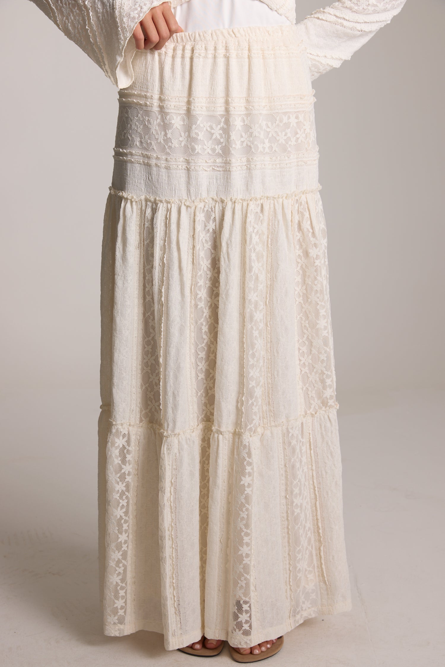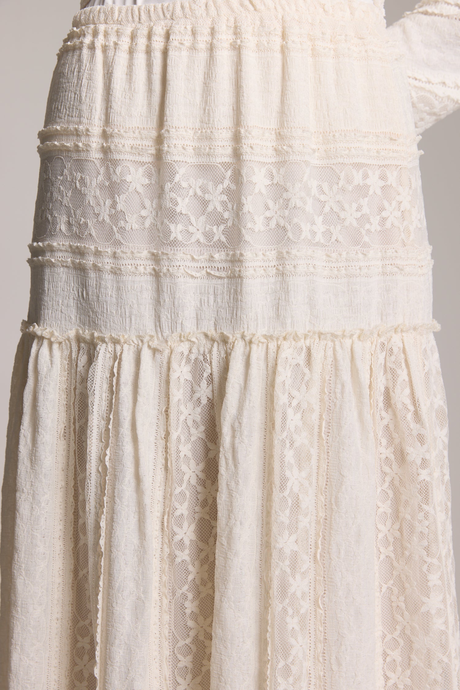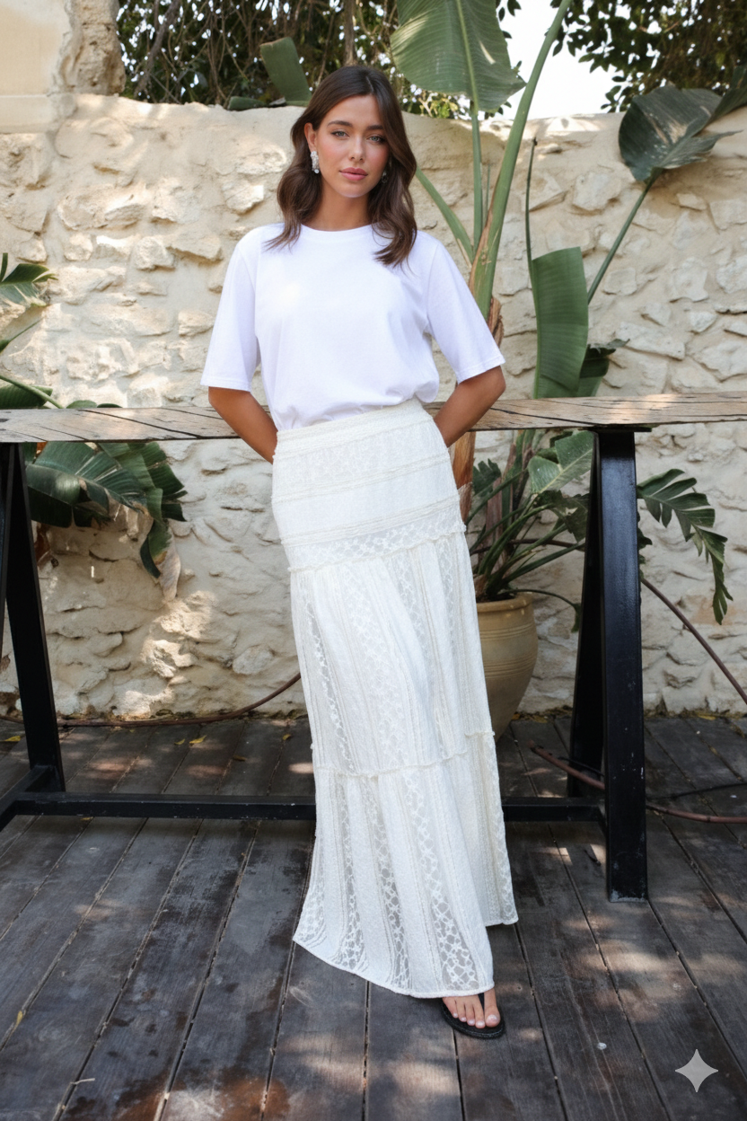 חצאית תחרה מקסי ארוכה עם מותן אלסטי ועיטורים לרוחב ואורך החצאית.